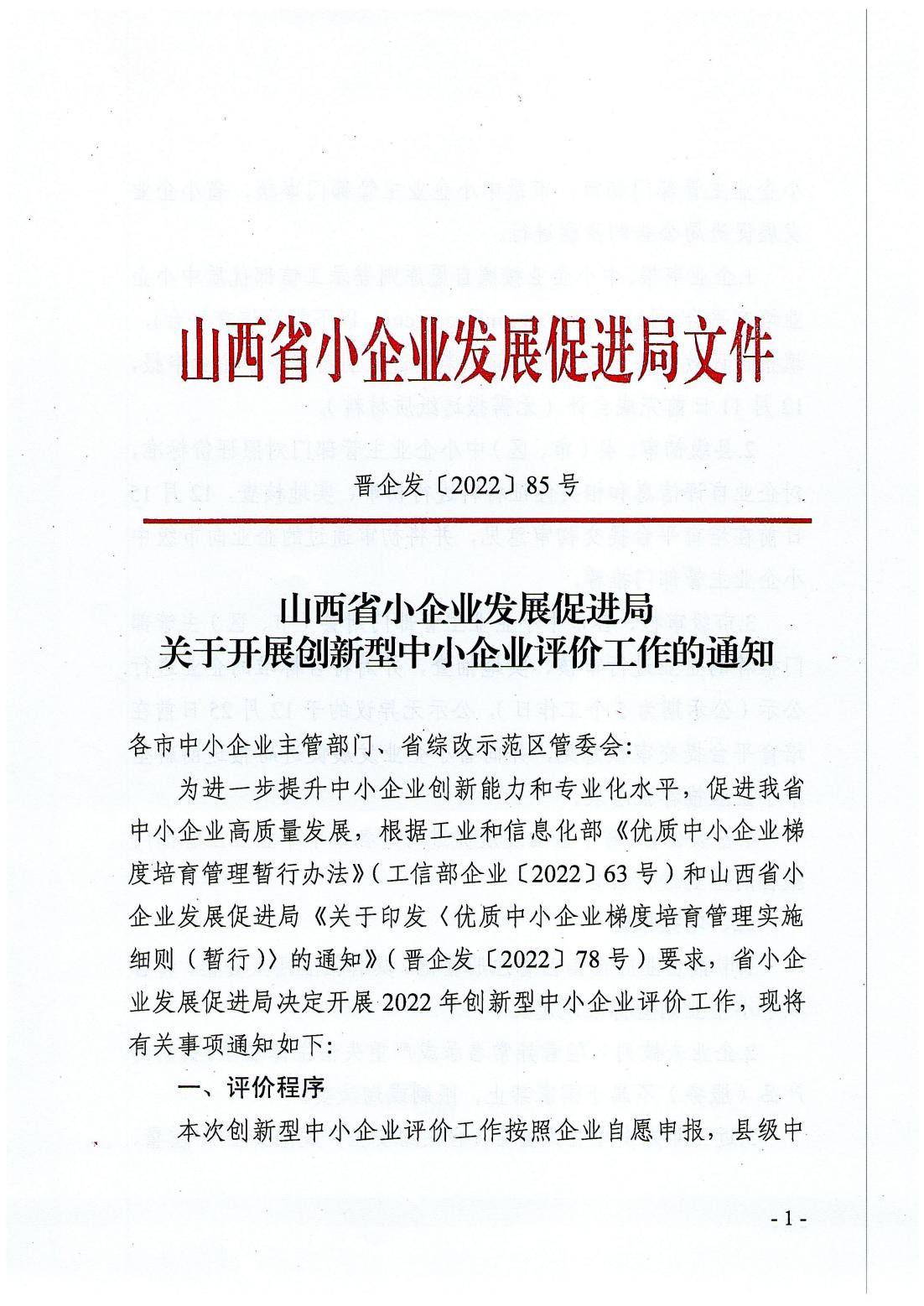關(guān)于開(kāi)展創(chuàng)新型中小企業(yè)評(píng)價(jià)工作的通知-晉企發(fā)【2022】85號(hào)
